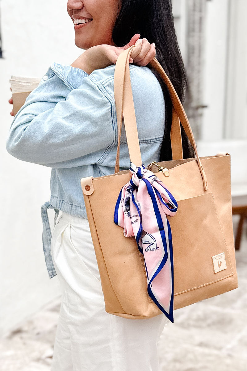 A woman holding the shoulder strap of the birch white bag with a tan body strap, tan tassel, and meanwhile logo.