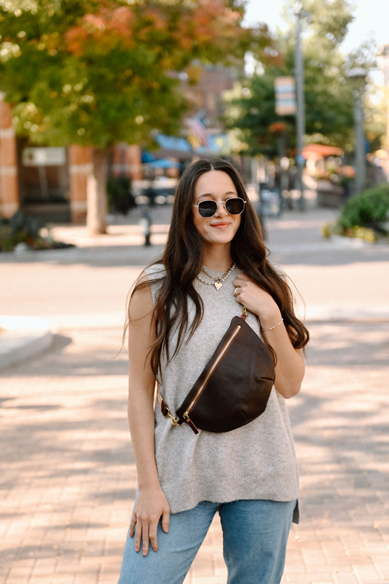 Model wearing small brown leather clutch as a cross body bag with long detachable leather strap.