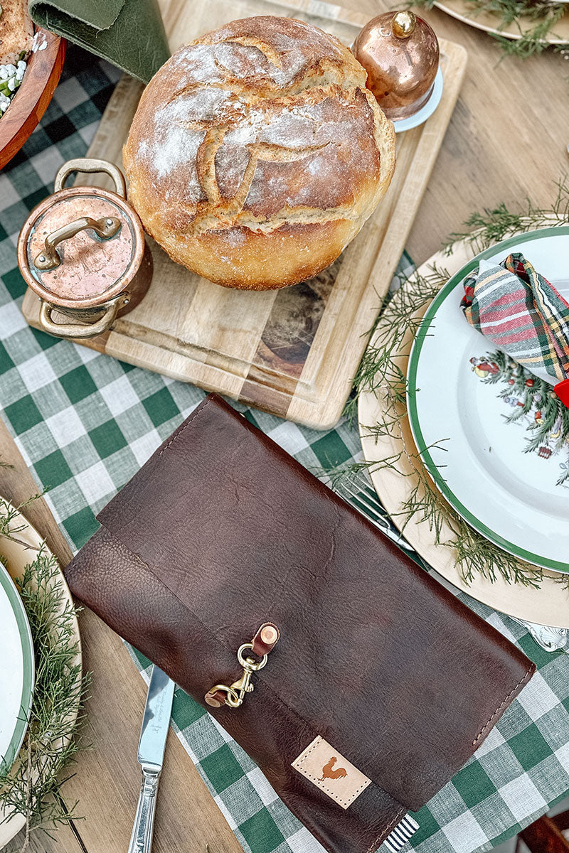 A festively decorated table with fresh baked bread. A dark brown leather clutch sits next to the Christmas dishes.