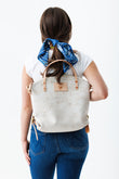 Woman wearing the birch white backpack with meanwhile logo and light brown straps.
