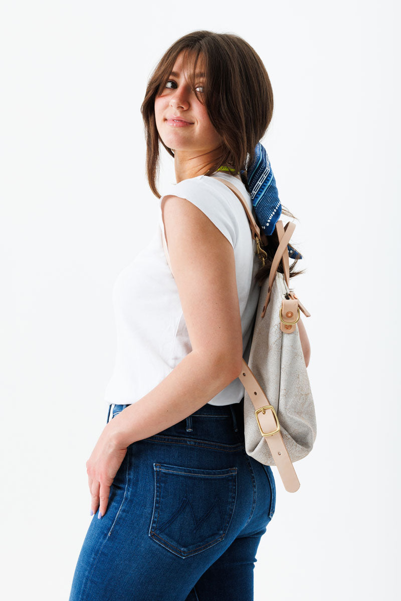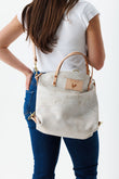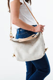 A woman wearing the birch white bag with tan straps and the meanwhile logo.