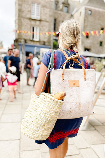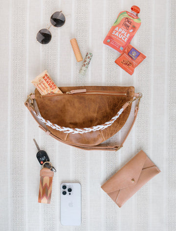 1.25" wide braided crossbody webbing strap Natural bonded leather woven with white cotton Finished with Vachetta (light/natural) leather ends...