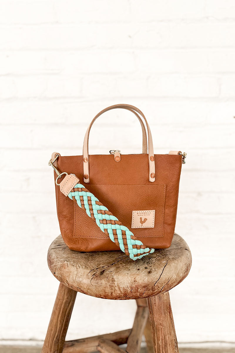shoulder bag within minutes. Colorful woven webbing, leather trim, and brass snap hooks.