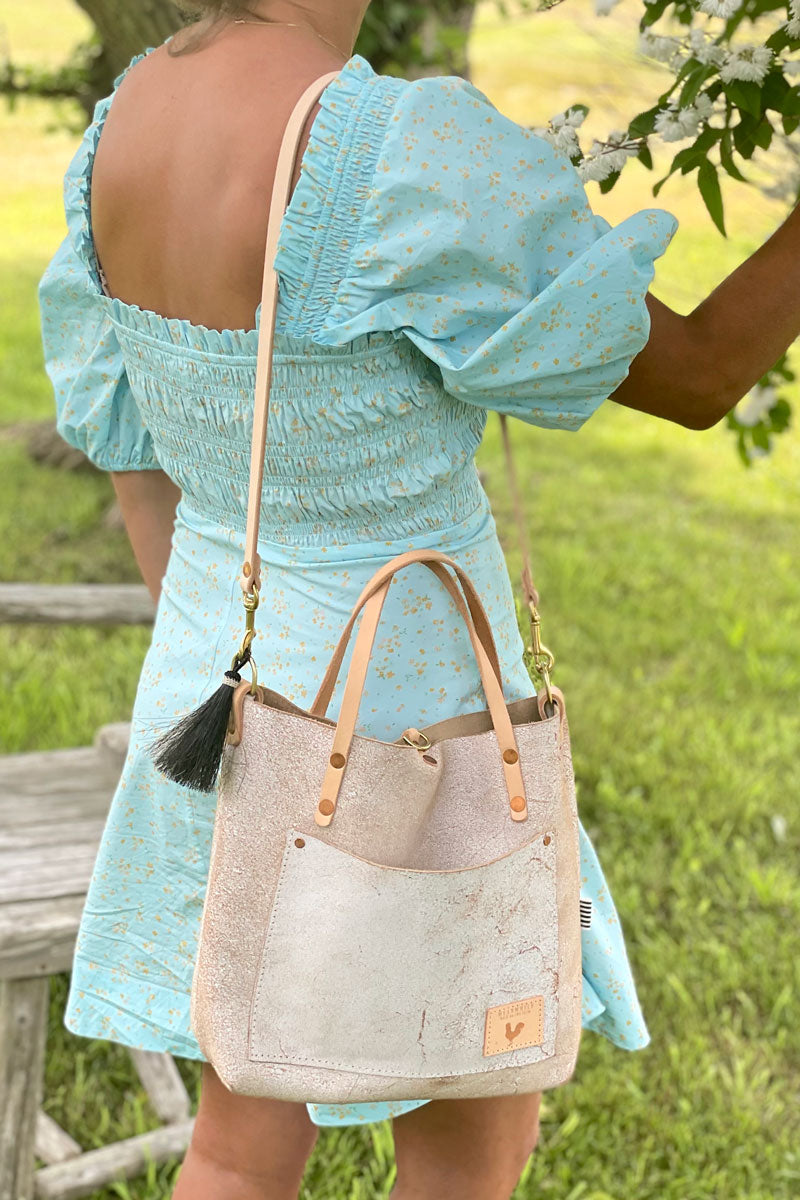 *Our Italian Vegetable Tanned Birch Leathers are crafted from Tuscan shoulder hides and tanned and hand distressed using an ancient hand-processing technique. It is untreated, warm, strong and personal. No two bags are the same, each marking is a memory that enriches the personality of your bag. The color variations and textured feel on our Birch leather is a uniquely a beautiful aesthetic that in no way changes the integrity of the leather.