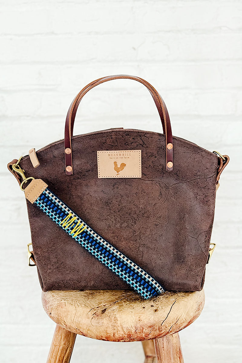 Dark brown leather bag on a stool with a blue woven crossbody strap