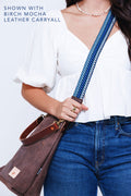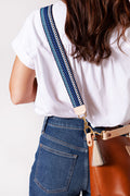 Girl wearing blue, white, and black patterned blue Italian webbing crossbody strap