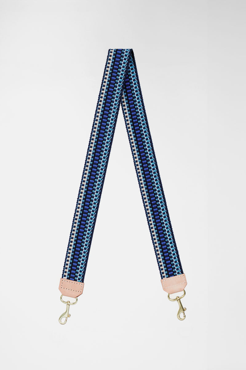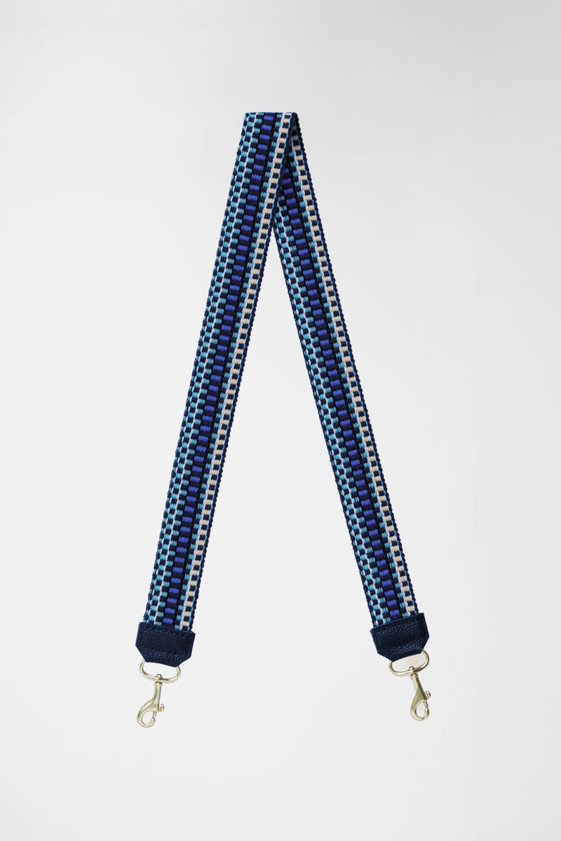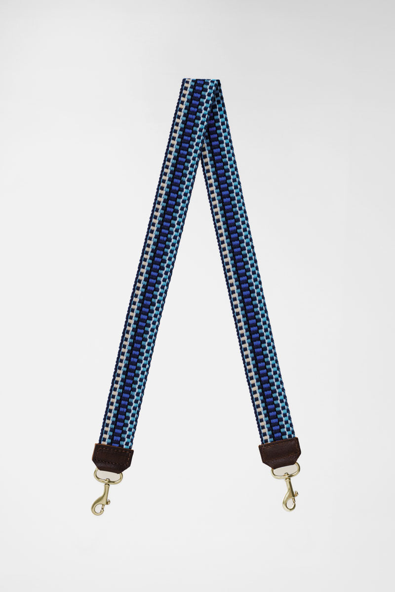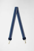 Picture of woven dark blue, light blue and cream colored replacement bag strap