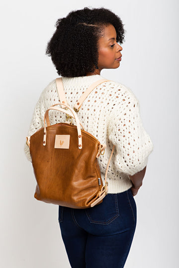 A woman wearing the camel brown backpack with tan straps and the meanwhile logo.