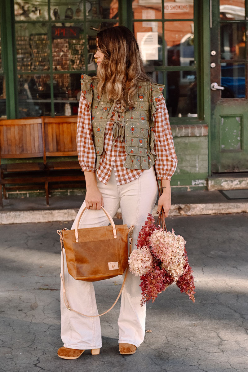 Woman standing in front of a store holding a small brown leather tote and a bouquet of pink/white flowers