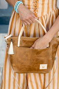 Less is more when it comes to cleaning your leather bag or canvas bag. Simply blot the undesired spot immediately with a dry white cloth to absorb the moisture. Avoid rubbing. If needed, mix mild dish soap with water (3:1 ratio) to blot the area. Keep in mind, the stain will look its worst on the day of the incident, but over time, the stain will disperse through the protein fibers and become part of the beautiful worn in look.