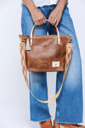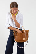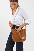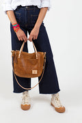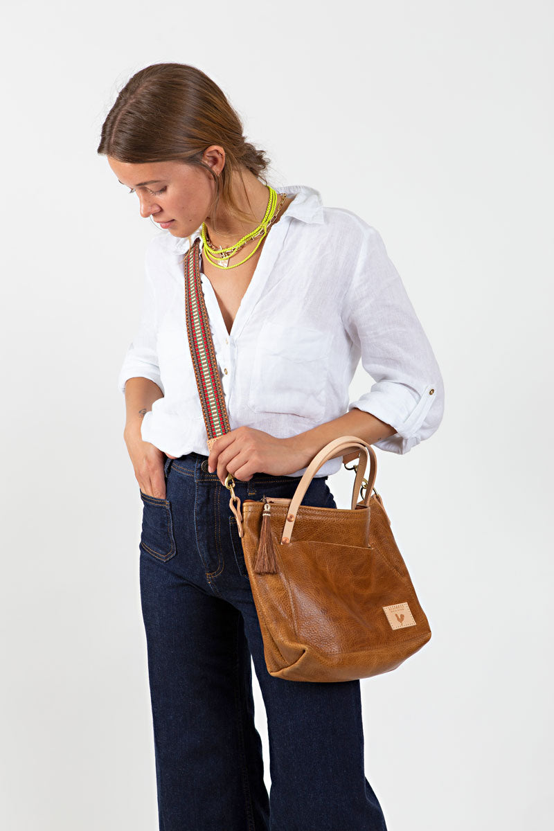 Woman wearing a light brown leather small tote with beige/orange webbing crossbody strap attached to it