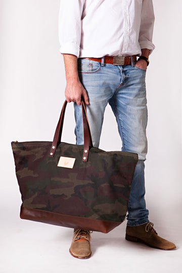 A man holding the camouflage weekend bag with the meanwhile logo and dark brown shoulder straps.