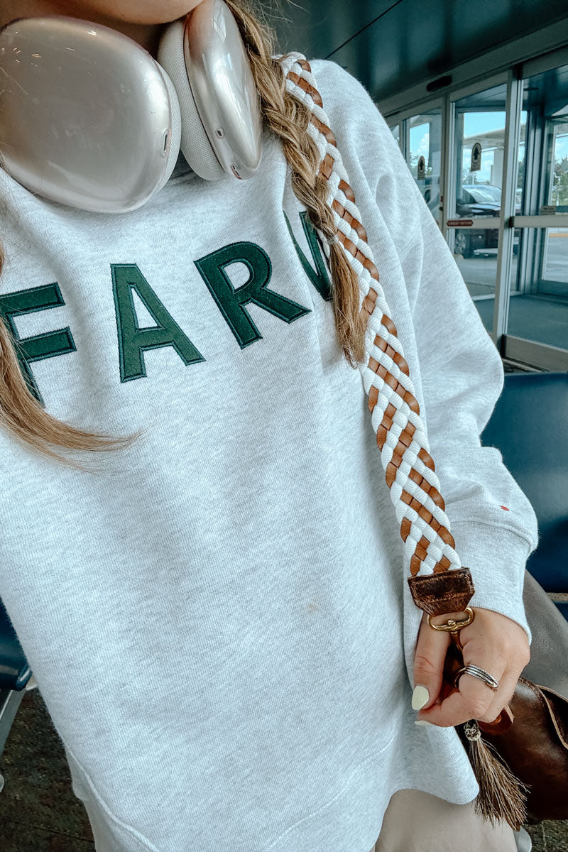 This women's boxy crew FARM sweatshirt features a classic hunter green felt 'FARM' graphic stitched across the front. Made from heavyweight, cotton-rich fleece with a brushed interior, this cozy crewneck offers a stylish oversized fit with dropped shoulders and a wide ribbed waistband, making it your new go-to favorite.