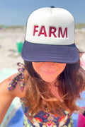 Our two-toned navy and white foam trucker hat features a 'FARM' embroidered design on the front and the Meanwhile logo on the back, both in bold red stitching. With a low-profile, unstructured crown, mesh backing, slightly curved visor, and adjustable snapback closure, it offers a classic fit and on trend style.
