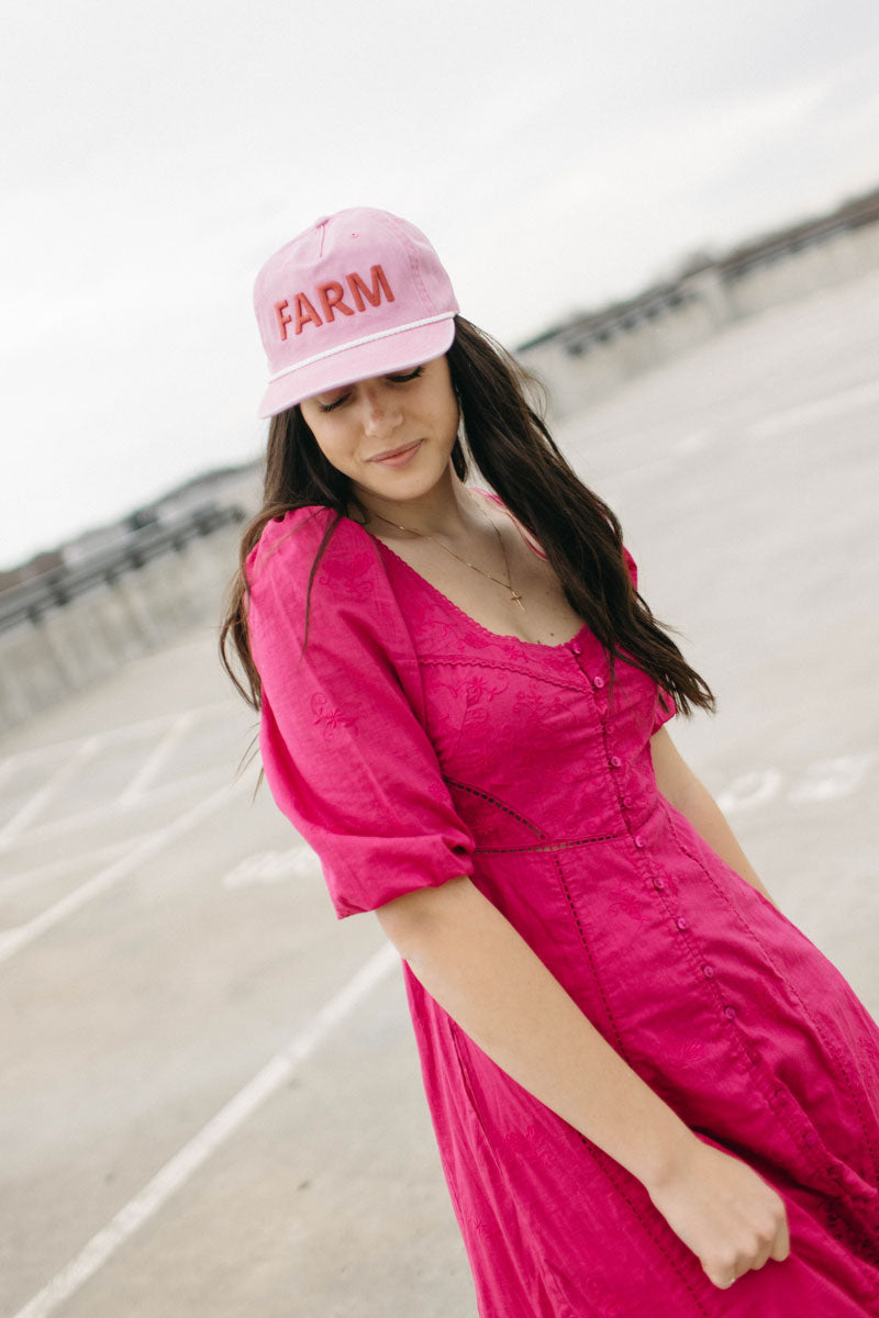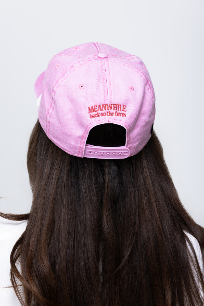 This pink skully hat combines a bold pigment-dyed cotton with a 5-panel structured, low-profile fit and snapback closure. Featuring a 'FARM' embroidered design on the front, the Meanwhile logo on the back in red stitching, and a retro-inspired rope detail for a vintage touch.