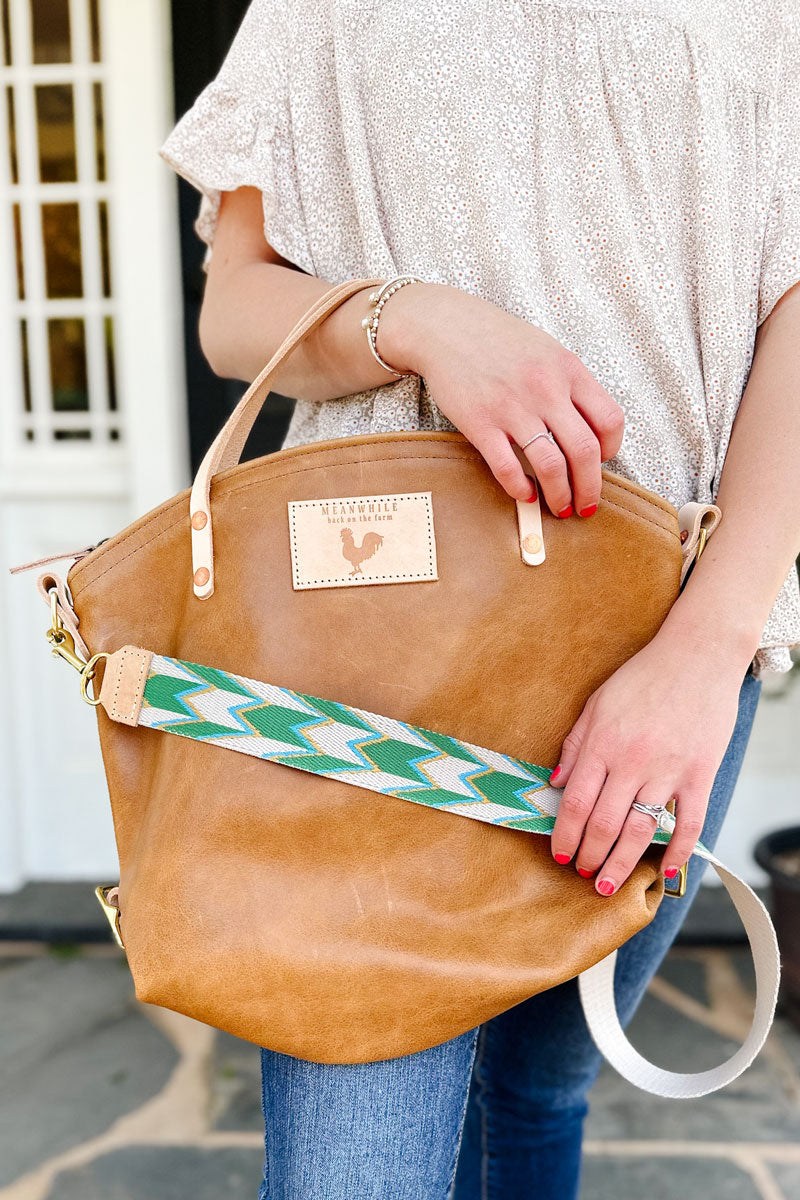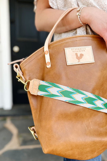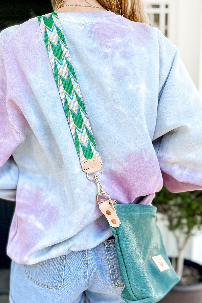 - 1.5"w light grey Italian webbing crossbody strap with green, blue, and mustard chevron accents