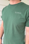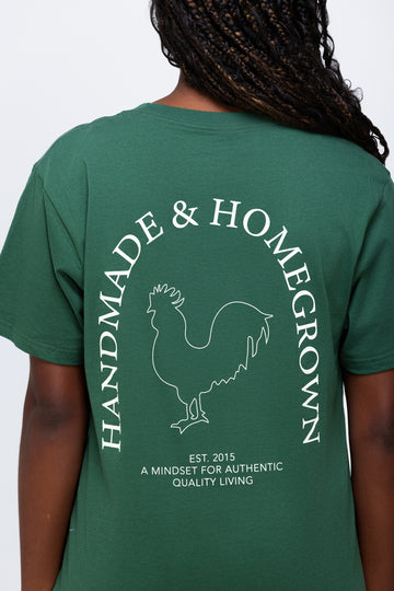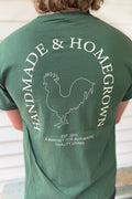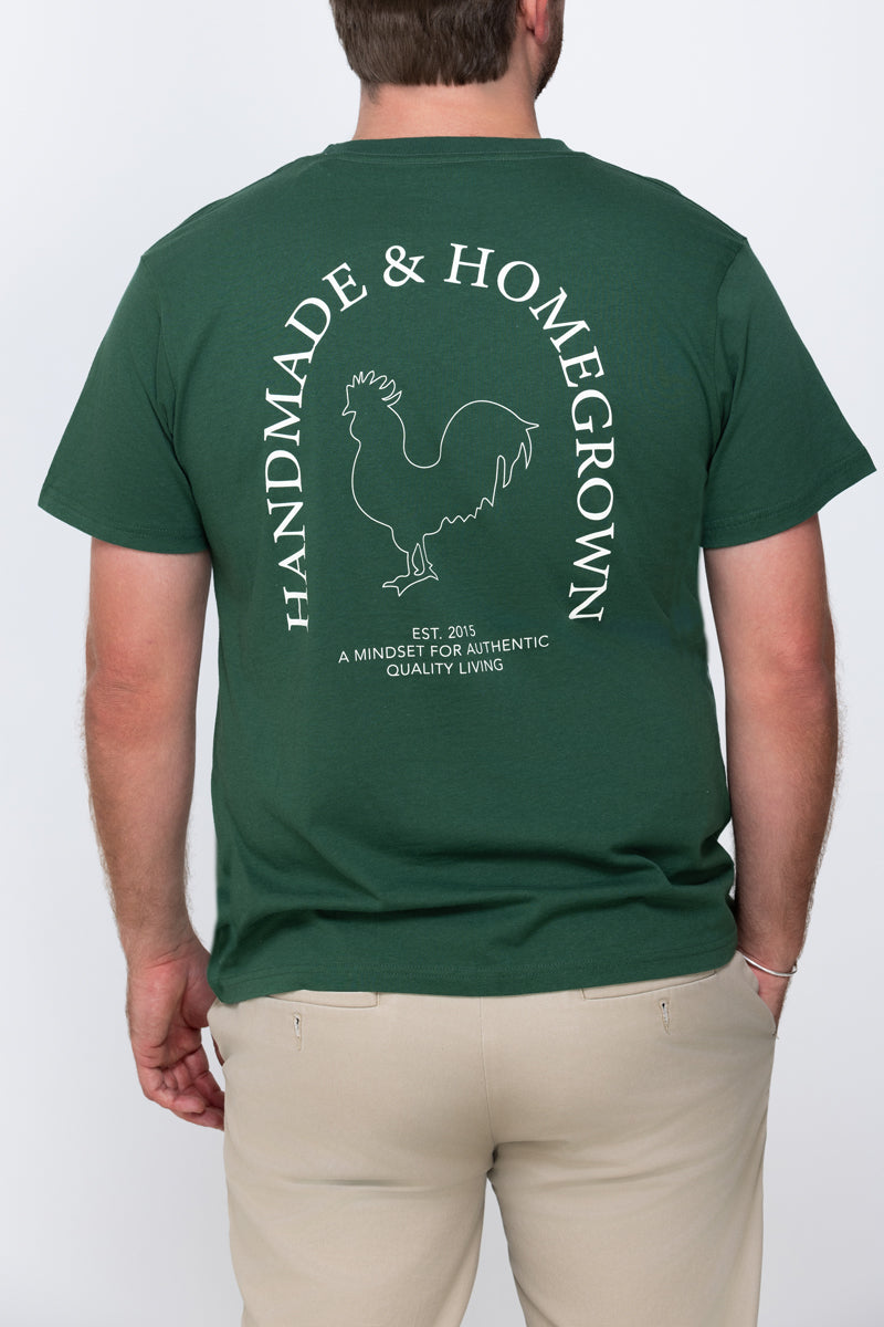 Male model wearing a hunter green reading 'Handmade & Homegrown' est 2015 A Mindset For Authentic Quality Living. Company's large rooster logo is outlined in the center