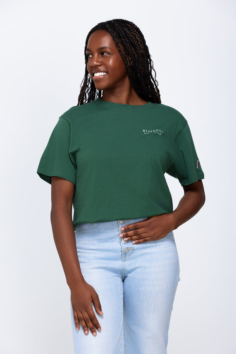 A League Unisex Tee in Vintage Hunter Green with "Handmade & Homegrown" artwork on the back and our classic logo on the front left chest.