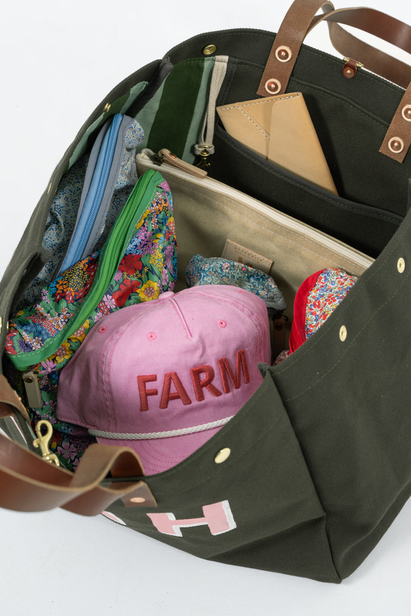 Our XL Snap Tote combines function, craftsmanship, and a touch of personalization. Designed and made right here in Virginia, this tote is crafted from thick duck canvas (not waxed), lined with a hand-blocked 2-toned striped cotton, and finished with a one-of-a-kind, hand-painted monogram. Fold and snap the top for a little extra enclosure, or leave it open when you need to pack it full.