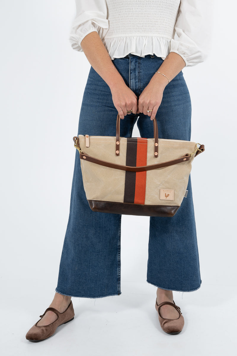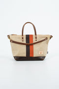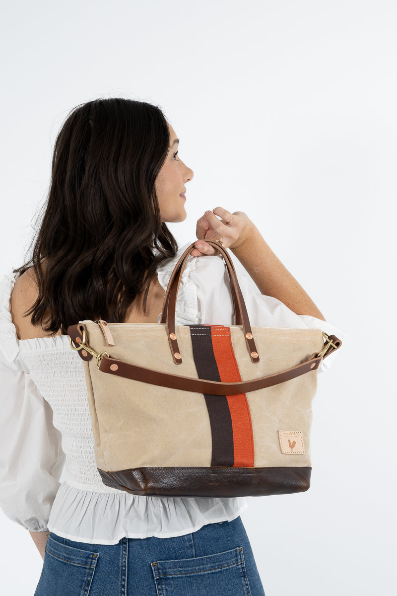 • Handcrafted with natural/cream treated waxed canvas,* brown leather base, and webbing straps down the center