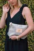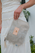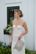 A luminous clutch made for special moments. With its shimmering pearl finish and soft suede feel, this wristlet adds a touch of elegance to every look. Just the right size for the essentials, it's the perfect companion for wedding days, bridal showers, or elegant evenings out.