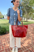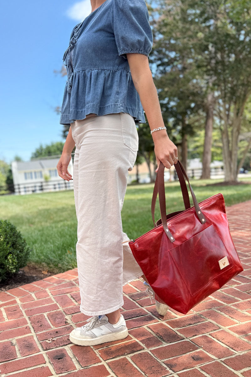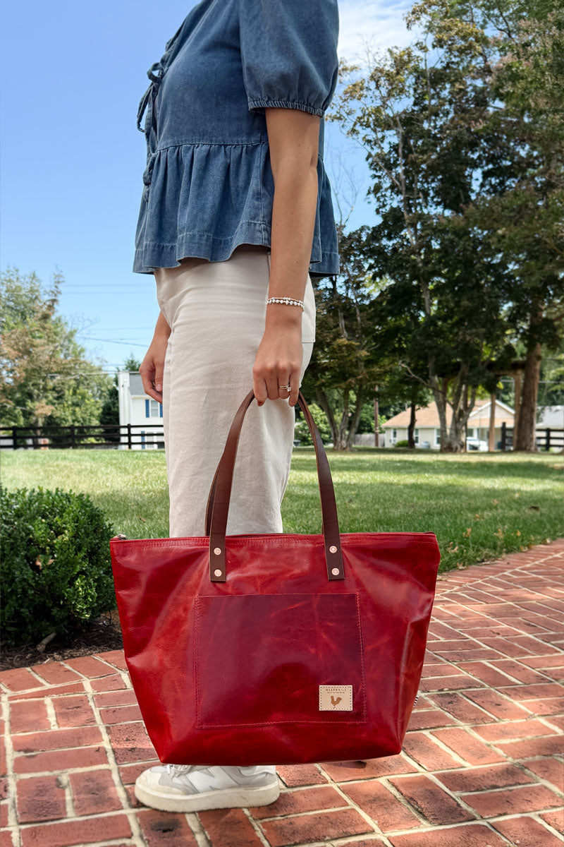 Less is more when it comes to cleaning your leather bag or canvas bag. Simply blot the undesired spot immediately with a dry white cloth to absorb the moisture. Avoid rubbing. If needed, mix mild dish soap with water (3:1 ratio) to blot the area. Keep in mind, the stain will look its worst on the day of the incident, but over time, the stain will disperse through the protein fibers and become part of the beautiful worn in look.