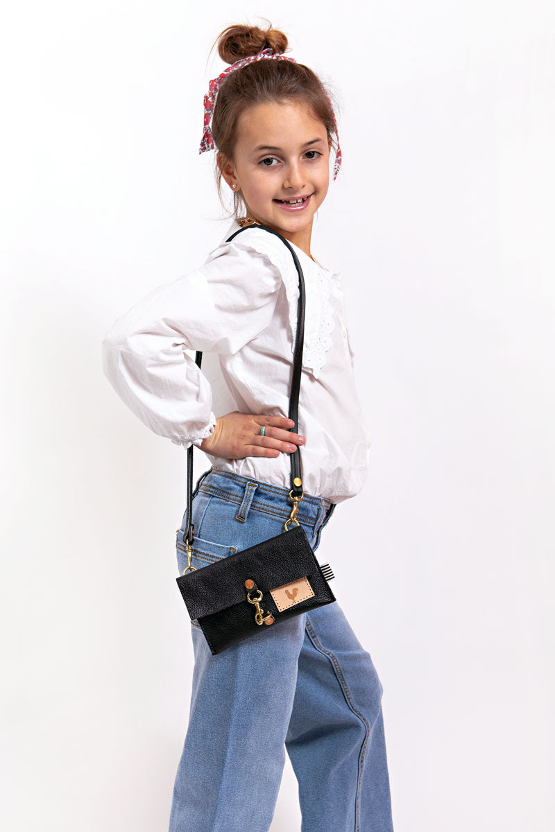 This little girls leather fold-over clutch was thought of by our dear daughter Lee. She has helped make this design from start to finish! This cute bag is just what your sweet girl needs to feel special.