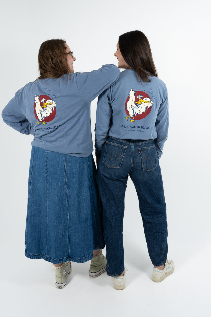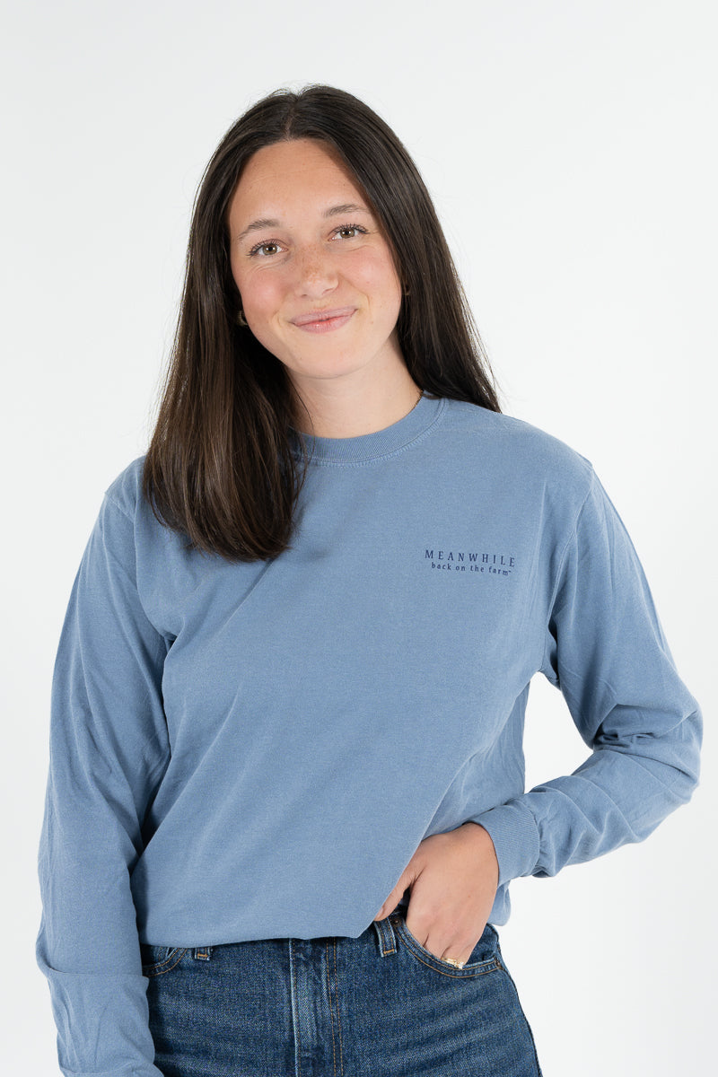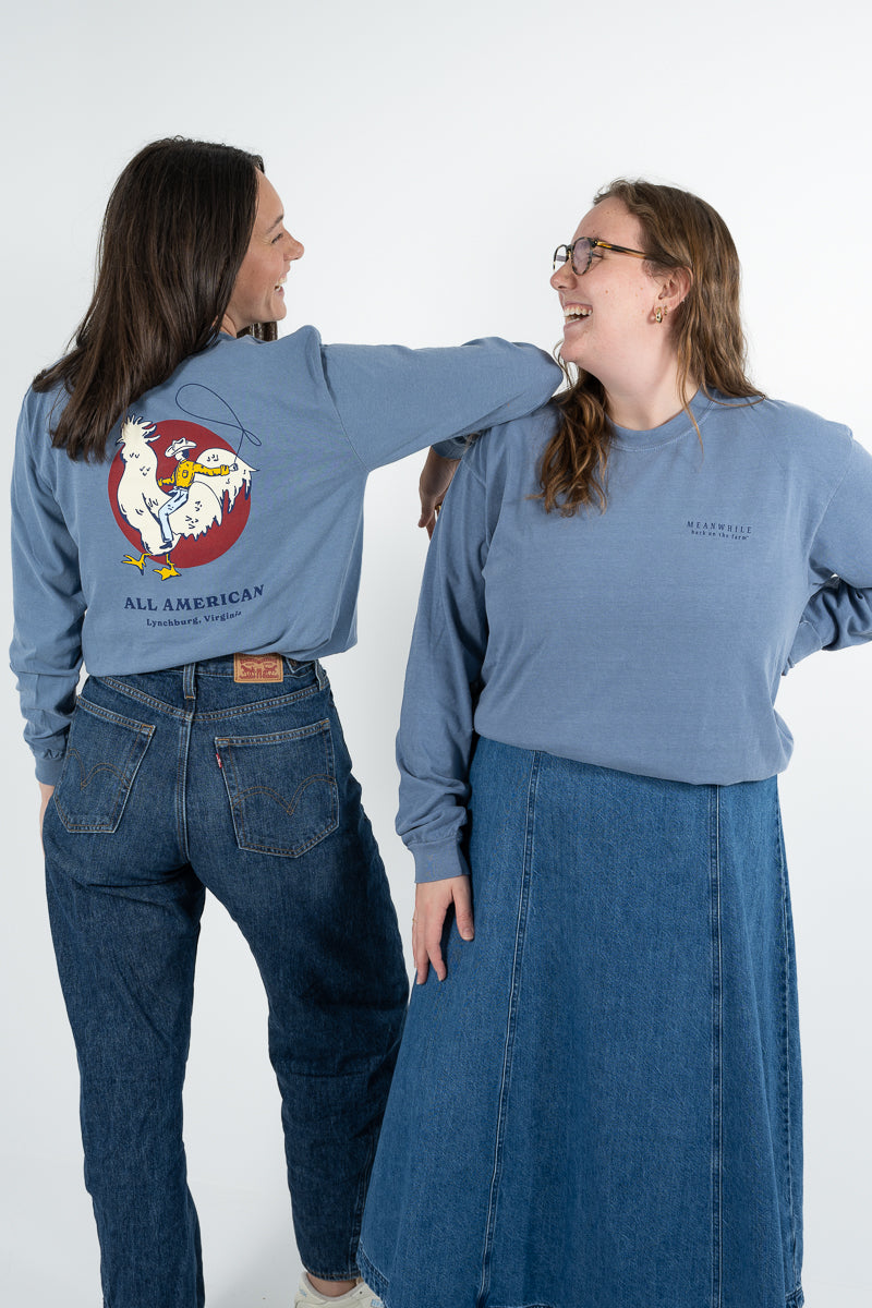 Slate blue Comfort Colors long sleeve with our All American design—soft, lived-in, and 100% Meanwhile. Made from preshrunk, 100% cotton and cut in a unisex fit, it’s the kind of tee that only gets better with wear. American-made spirit, farm-fresh fun, and comfort you’ll keep reaching for.