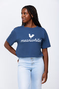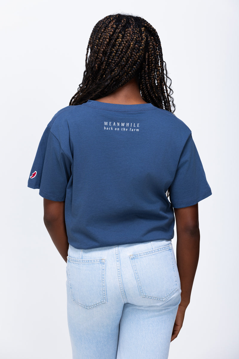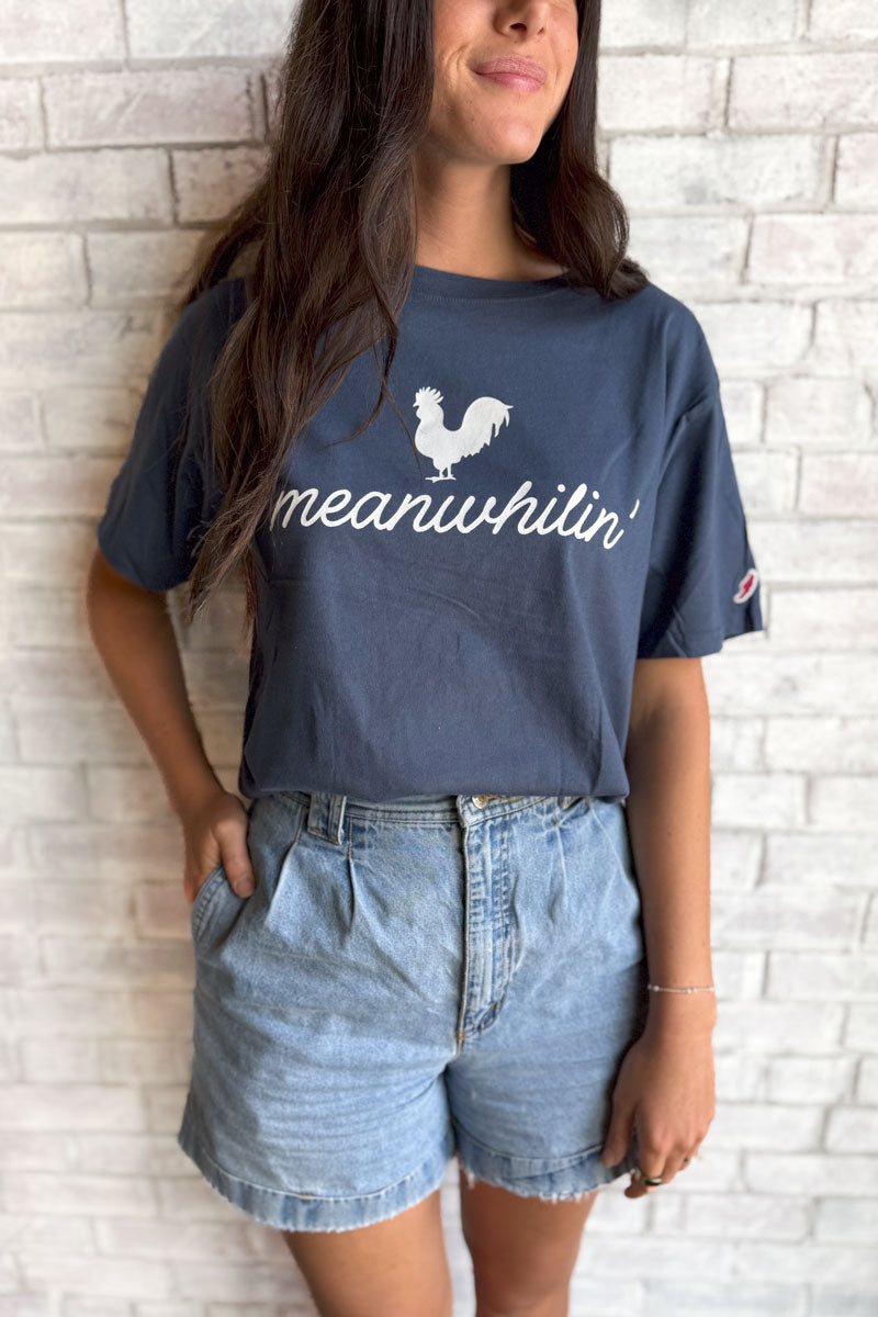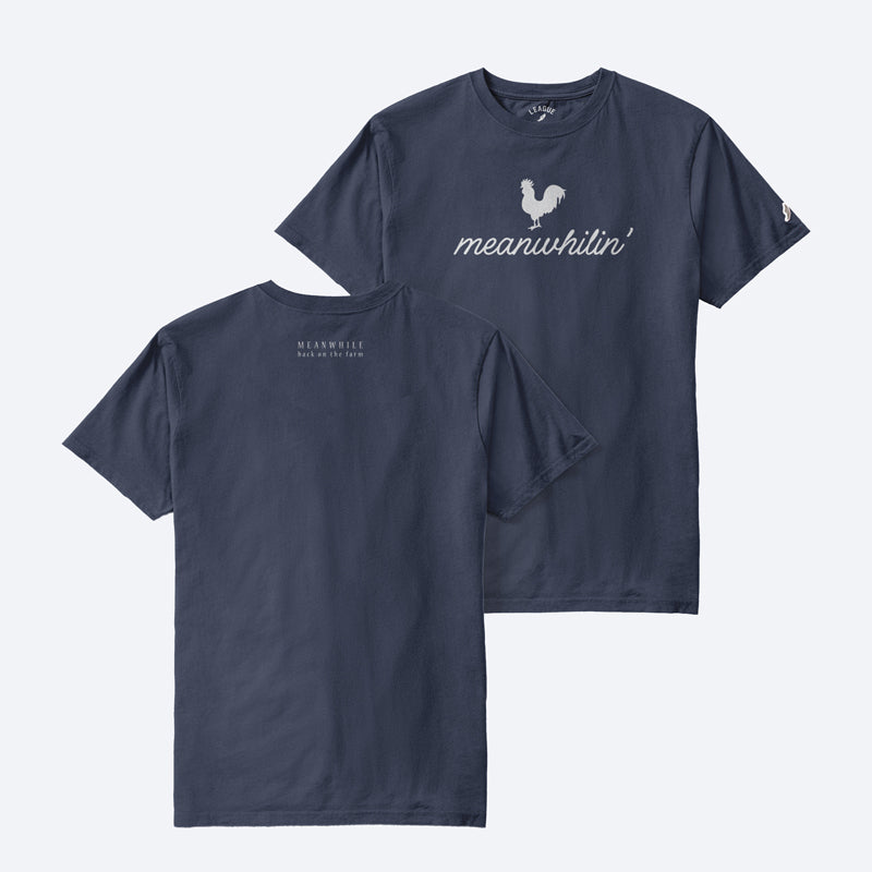 A League Unisex Tee in Navy with our classic Meanwhile Rooster and "Meanwhilin'" on the front in white.