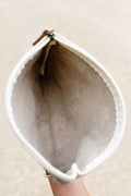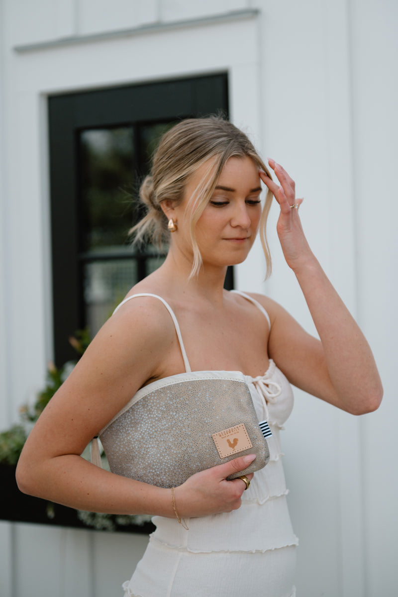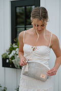 A stunning bridesmaid gift or day-of essential, this soft pearl suede clutch is as versatile as it is beautiful. Use it to organize makeup or must-haves inside a larger tote, or carry it on its own for bridal showers, rehearsal dinners, or honeymoon dinners out. The subtle shimmer makes it the perfect polished touch for every wedding moment.