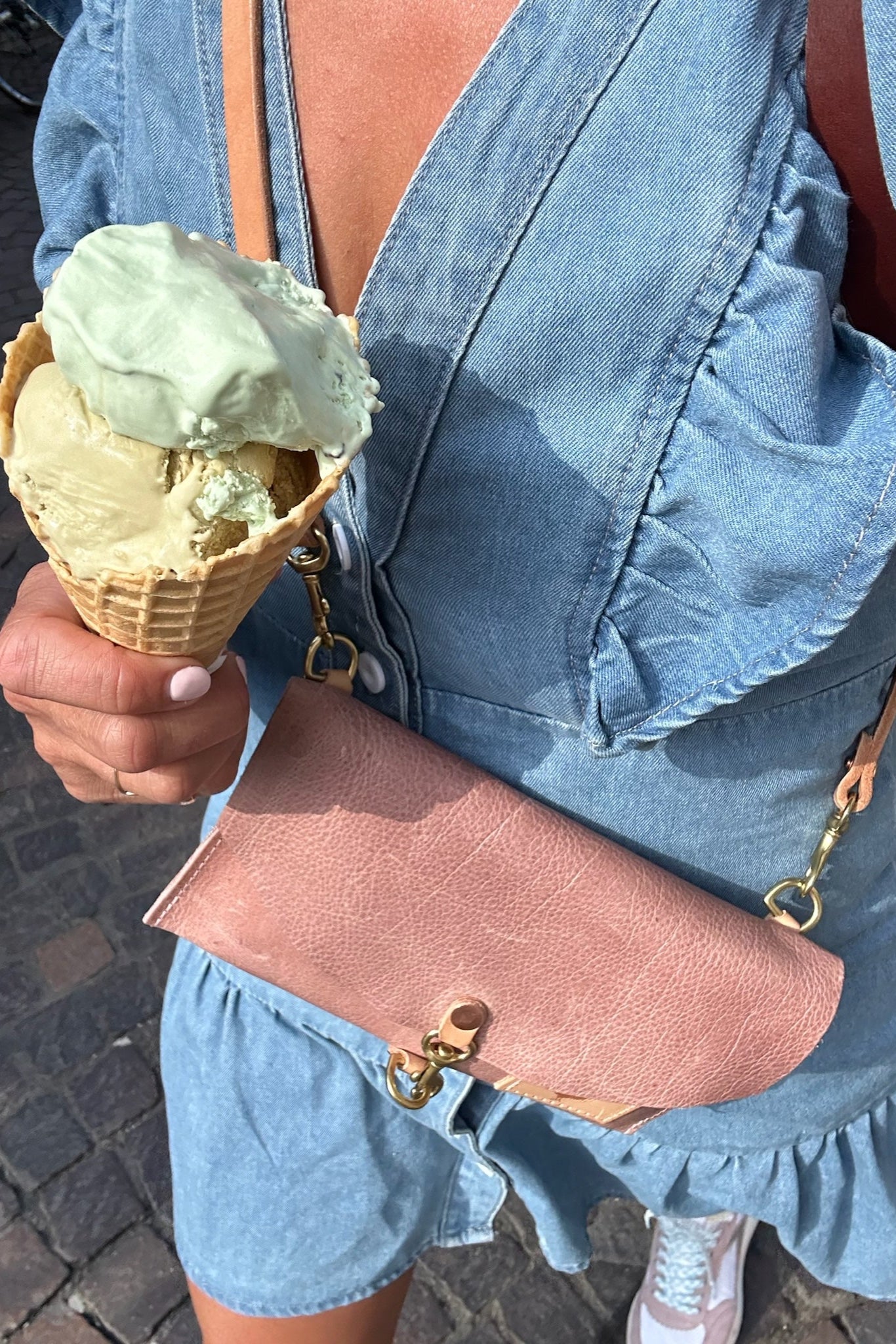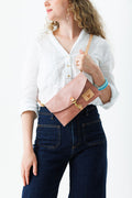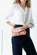 Woman wearing the rose pink colored bag with a hook that closes the bag, meanwhile logo, and a light brown cross body strap.