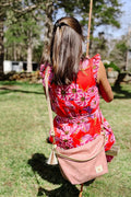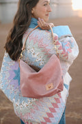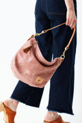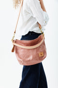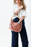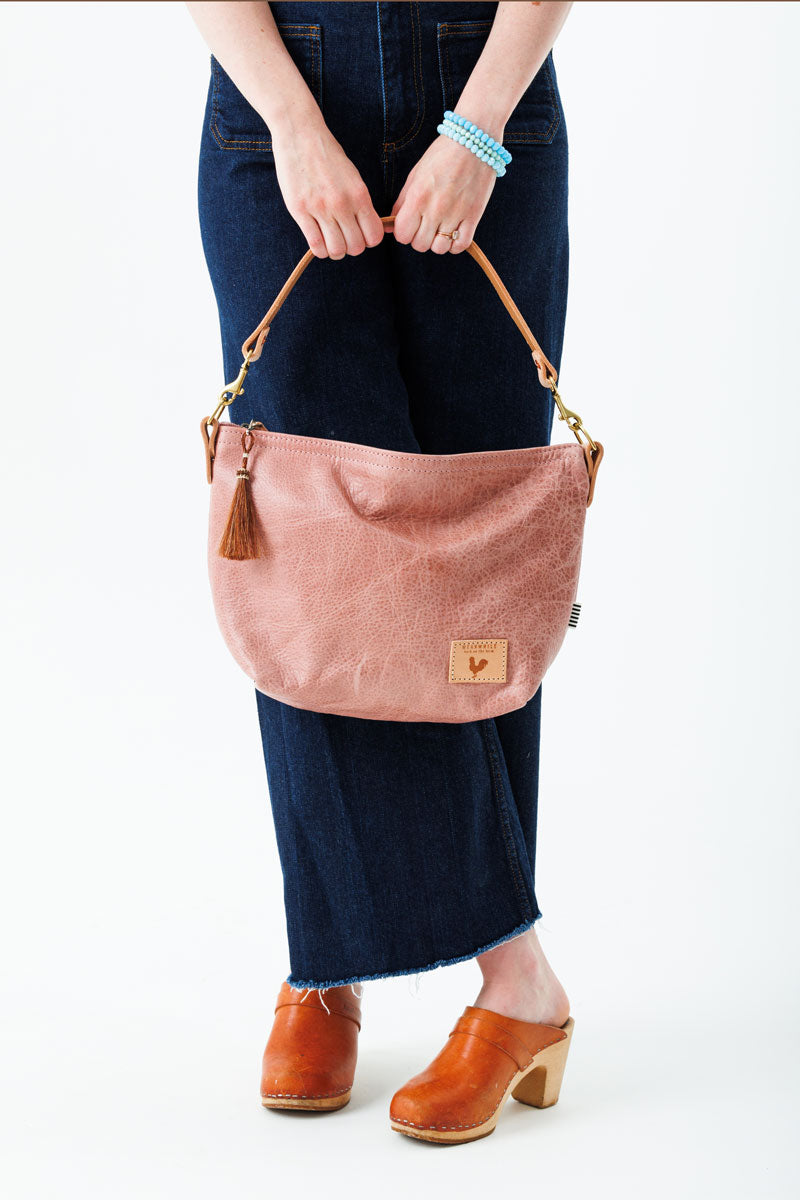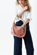A woman wearing over the shoulder the rose pink bag with the meanwhile logo and a brown tassel zipper.