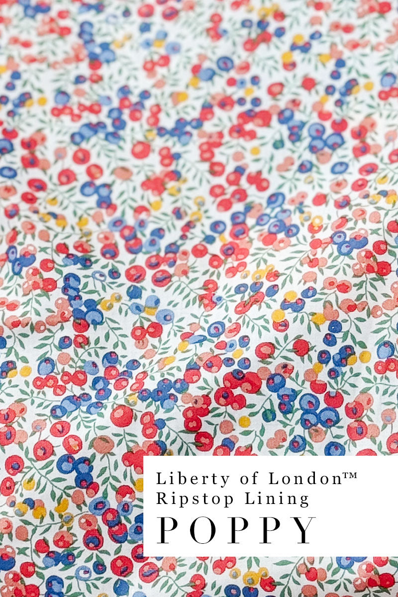 Model's hand holding a white medium sized red zippered bag with a red and blue flowery pattern