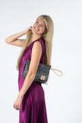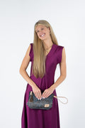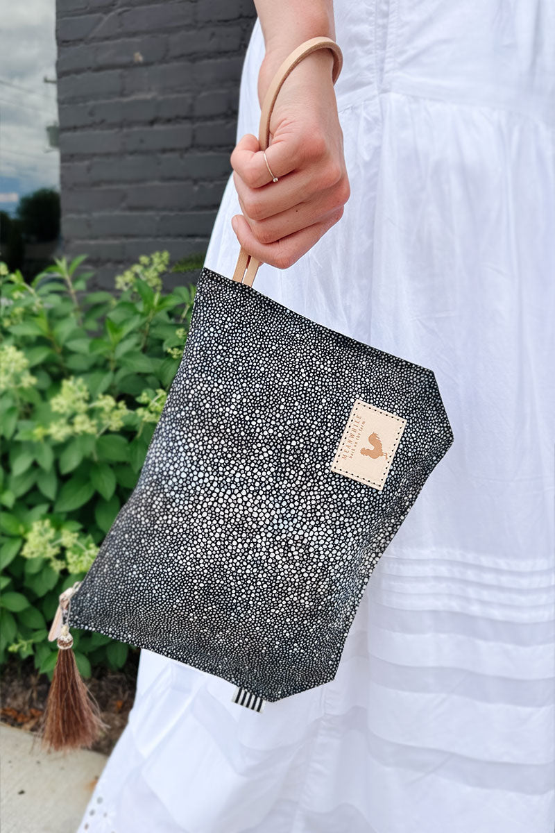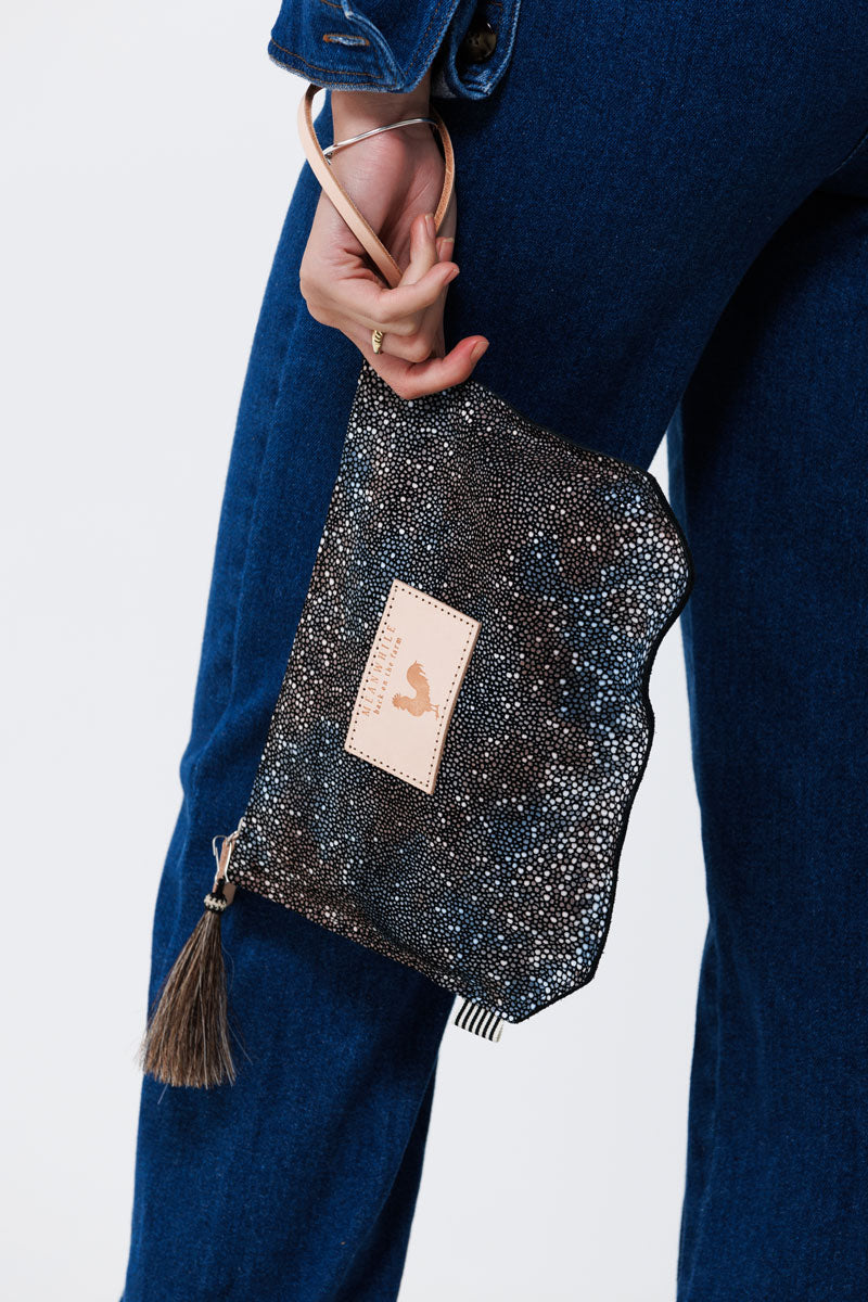 Here to make a statement, this Wristlet is crafted with the exotic Stingray leather boasting a light-filled sparkling transfer on a dark blue and black suede leather. Add a little "wow" to your wardrobe. The Wristlet is a perfectly sized clutch for all of life's necessities.