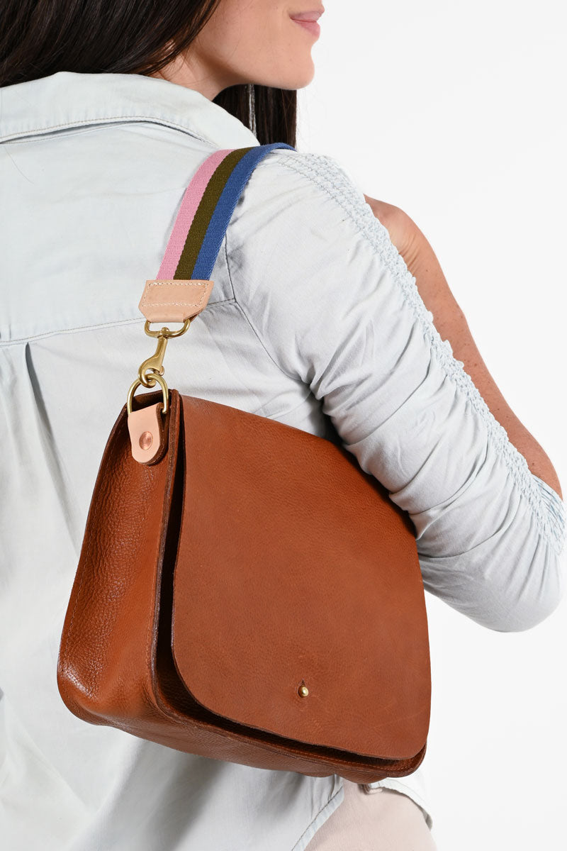 shoulder bag within minutes. Colorful woven webbing, leather trim, and brass snap hooks.